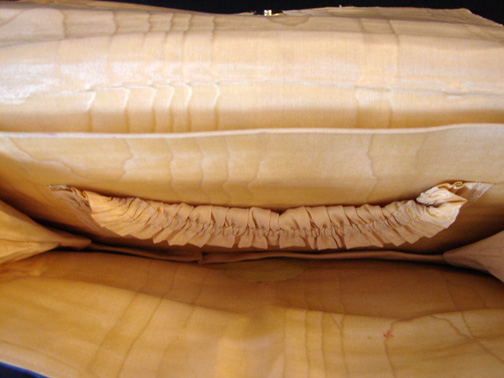 Measuring 10 1/4" by 7 1/2". In good condition, slight minor wear on edge of inside silk and a couple of marks on back.