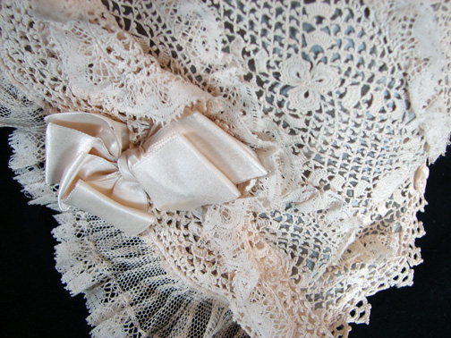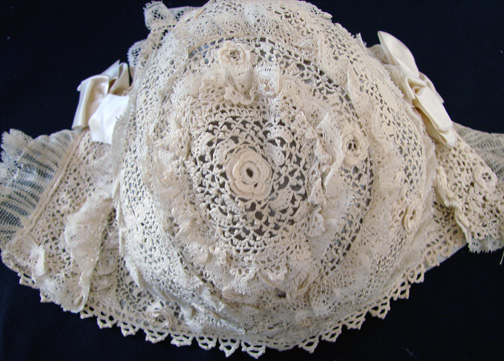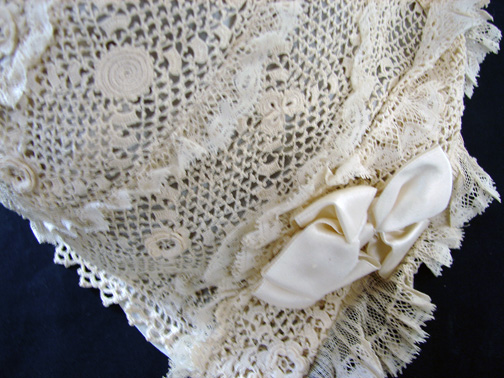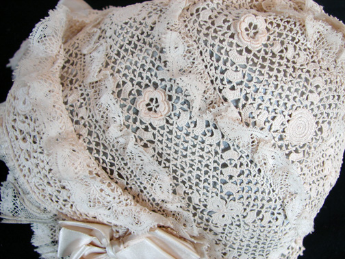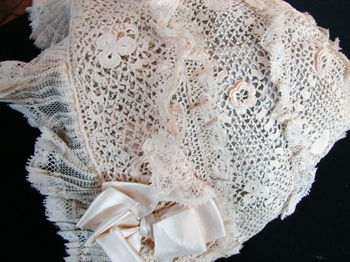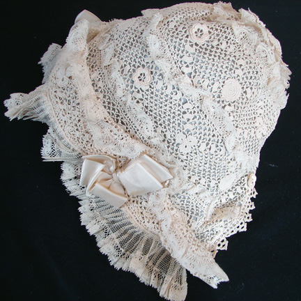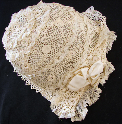 Circa 1900, Irish Crochet Bonnet w/ Silk Ribbons