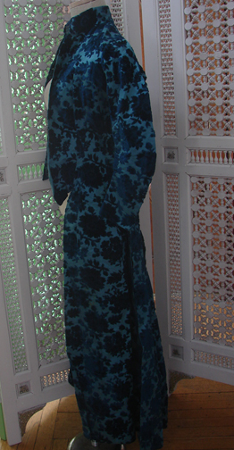 Measuring apprx. 12" shoulder to shoulder, 12" around mandarin collar, 15" across chestline, apprx 20-21" around waistline, 7 1/4" across armhole, and 52" long at the back. In manily good condition, there are some scattered discolorations, very minor. |