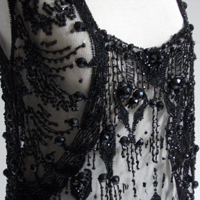 Circa 1900, quite a dazzling Edwardian net bodice with an amazing array of elaborate jet beads that are different sizes and shapes. Measuring appr. 26" long but tapering lower at the front, apprx. 22-24" across chestline, and almost 9" across armhole.