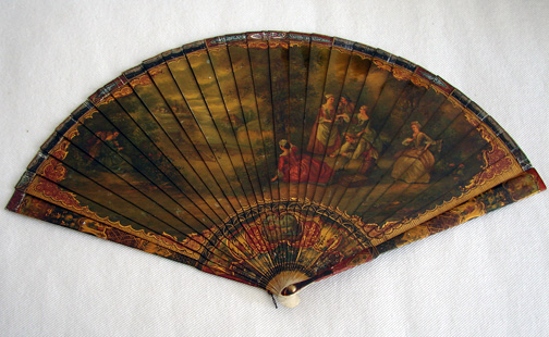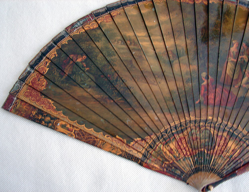 The technique invented by Guillame and Etienne-Simon Martin was given a royal patent during the 1700's. It was a period when Chinese lacquer was in great demand. The technique is said to be made by heating oil, copal, and Venetian turpentine. Measuring apprx. 8 1/2". Mainly good condition, some minor wear on lacquer and one small area near top of fan.