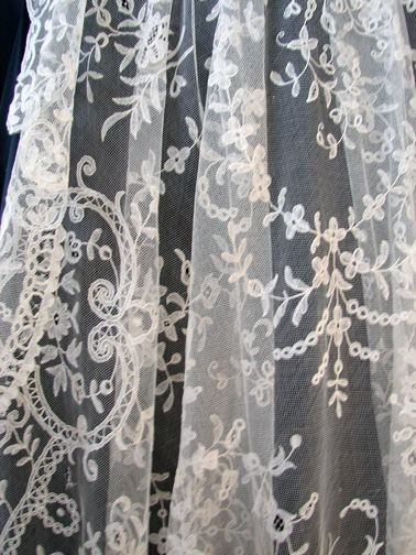 Measuring apprx. 73" by 70-72". Centimetres appr. 178-190cm. In mainly good condition, a few tiny repairs and one large repair where the wedding head piece would have been.