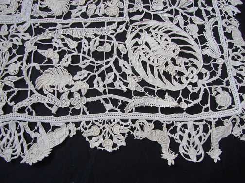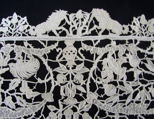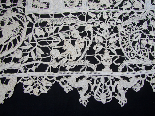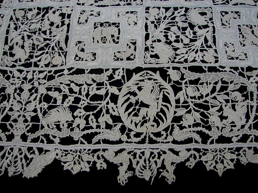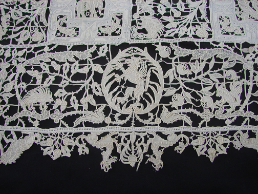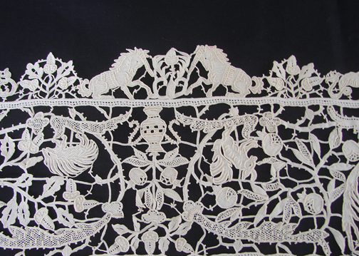Measuring 64" by 25" wide. In overall very good condition, one small stain, a few openings, and one edge has a missing animal. All this seems to me quite minor on such a magnificent piece.