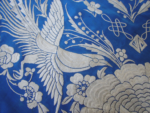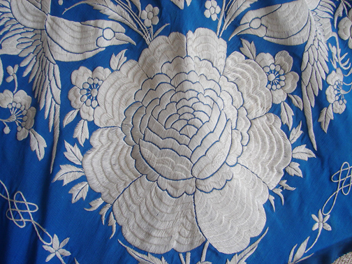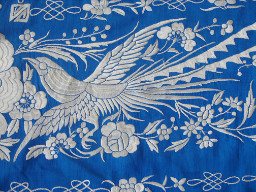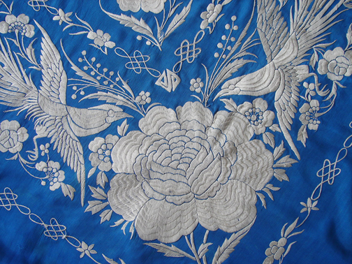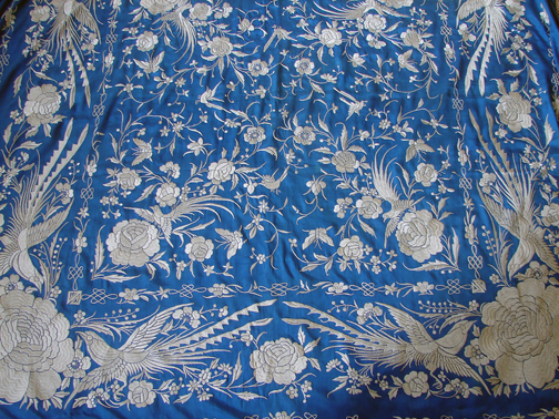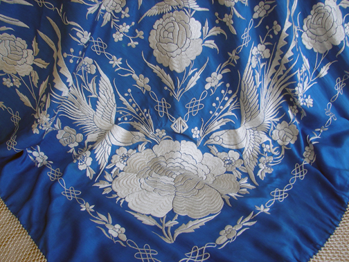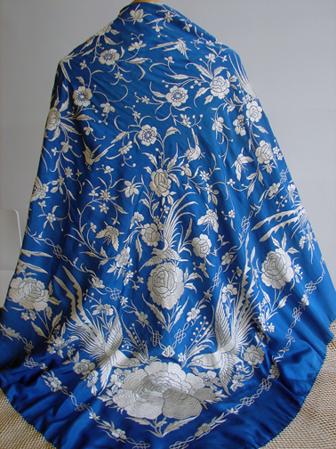 Vibrant Blue Canton Silk Shawl w/ Birds