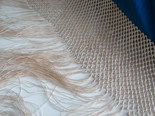 Measuring apprx. 52" with a additional 27-28" for wide macrame fringe. This shawl is in excellent condition. The corners are slightly rounded which means it was used for a table or large piano.