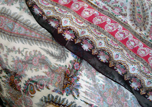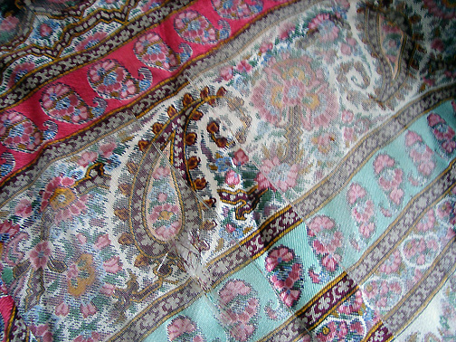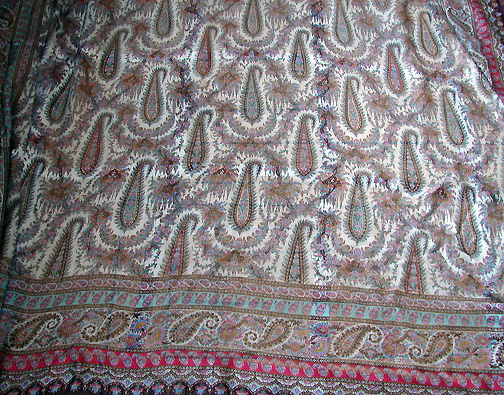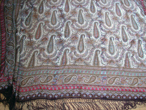 Measuring apprx. 142" with 5-6" fringe on each end, and 71" wide. In mainly very good strong condition, one wear area and some holes on plain gauze edges.